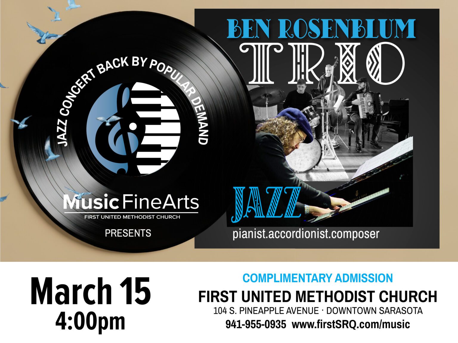 The Music Fine Arts Series is one of the church’s largest commitments to the Sarasota area. Our concert series has a long-distinguished history. First United Methodist Church is a prominent concert venue due to its prime downtown location and large seating capacity. In 2010 the sanctuary underwent significant renovations which resulted in the expanded chancel area and locally unparalleled acoustics. Music of all genres – jazz, gospel, classical, modern, choral, orchestral – are breathtaking in this sacred space. Also included are our special seasonal events, such as the Christmas Gala and Carol Sing!